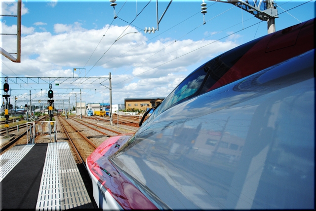 秋田へ向けて進行方向を変えて出発する新幹線を見送り