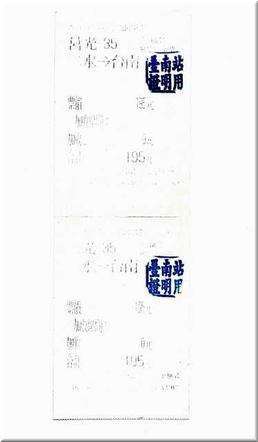 【きっぷ】二水⇒台南 きっぷ 2016年10月22日 臺灣鐵路局 縦貫線(南段)《二水⇒台南》 莒光35号車内にて発行した車内補充券です。(画像は2名分) 乗車券+急行券なのか急行券のみかは記憶が定かではありません。 日が経ってしまいかなり劣化してしまいました。 感熱タイプは直ぐに処理しないといけませんね。 [0回]PR http://tetsukotabi.iku4.com/%E3%81%8D%E3%81%A3%E3%81%B7/%E3%80%90%E3%81%8D%E3%81%A3%E3%81%B7%E3%80%91%E4%BA%8C%E6%B0%B4%E2%87%92%E5%8F%B0%E5%8D%97%E3%80%80-%E8%BB%8A%E5%86%85%E8%A3%9C%E5%85%85%E5%88%B8%E3%83%BB%E8%87%BA%E7%81%A3%E9%90%B5%E8%B7%AF%E5%B1%80-【きっぷ】二水⇒台南