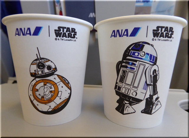 機内に入るとヘッドカバーと紙コップも同じ仕様でした。