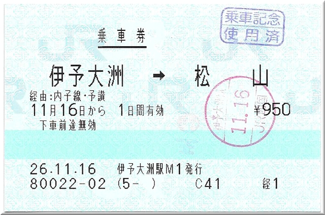 余談ですが、伊予大洲→松山の乗車券には『伊予灘ものがたり』の印がうっすら写っています。